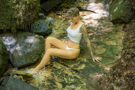 Hübsche natürliche Blondine mit wenig Schmincke in heißen Dessous